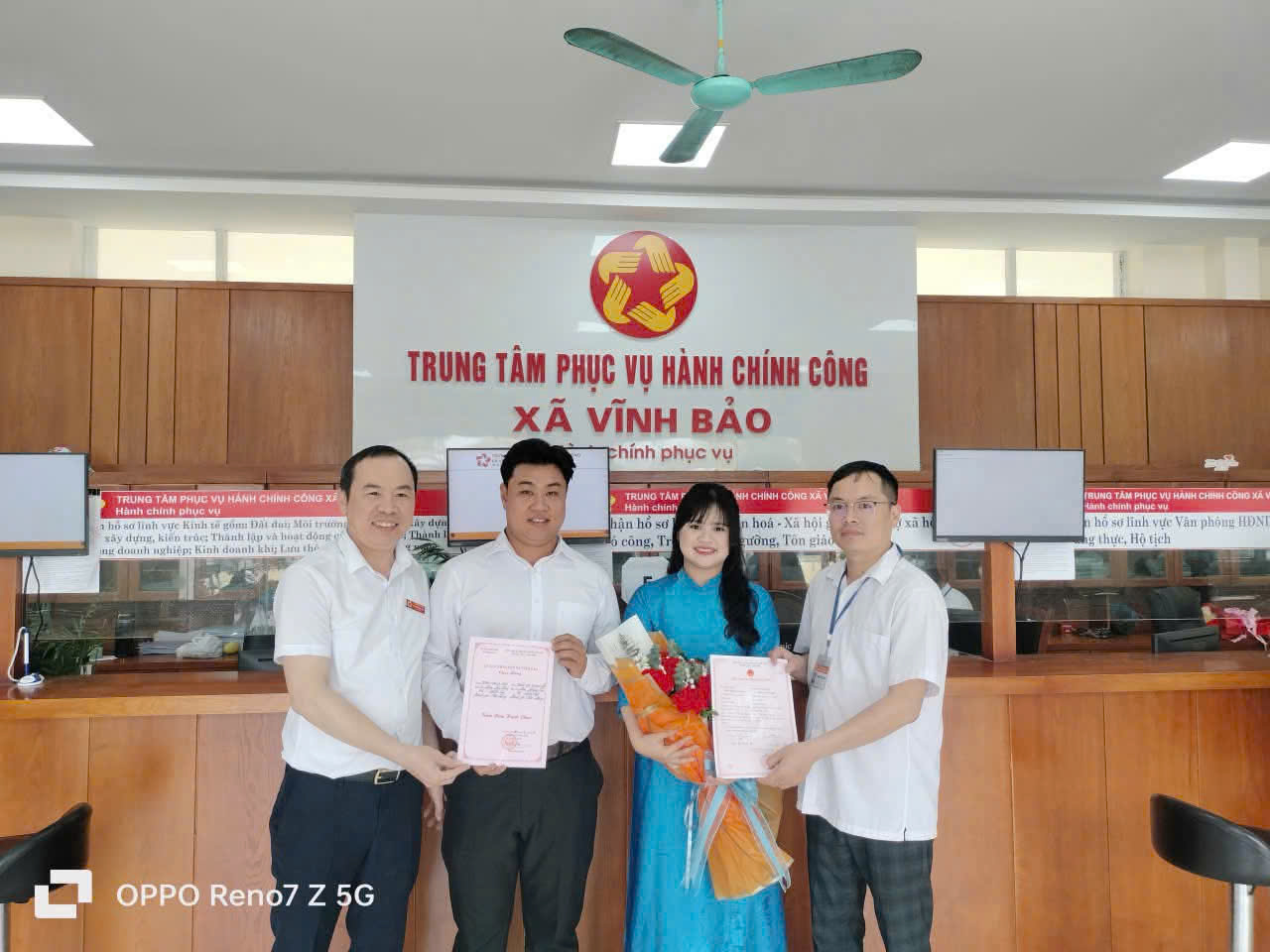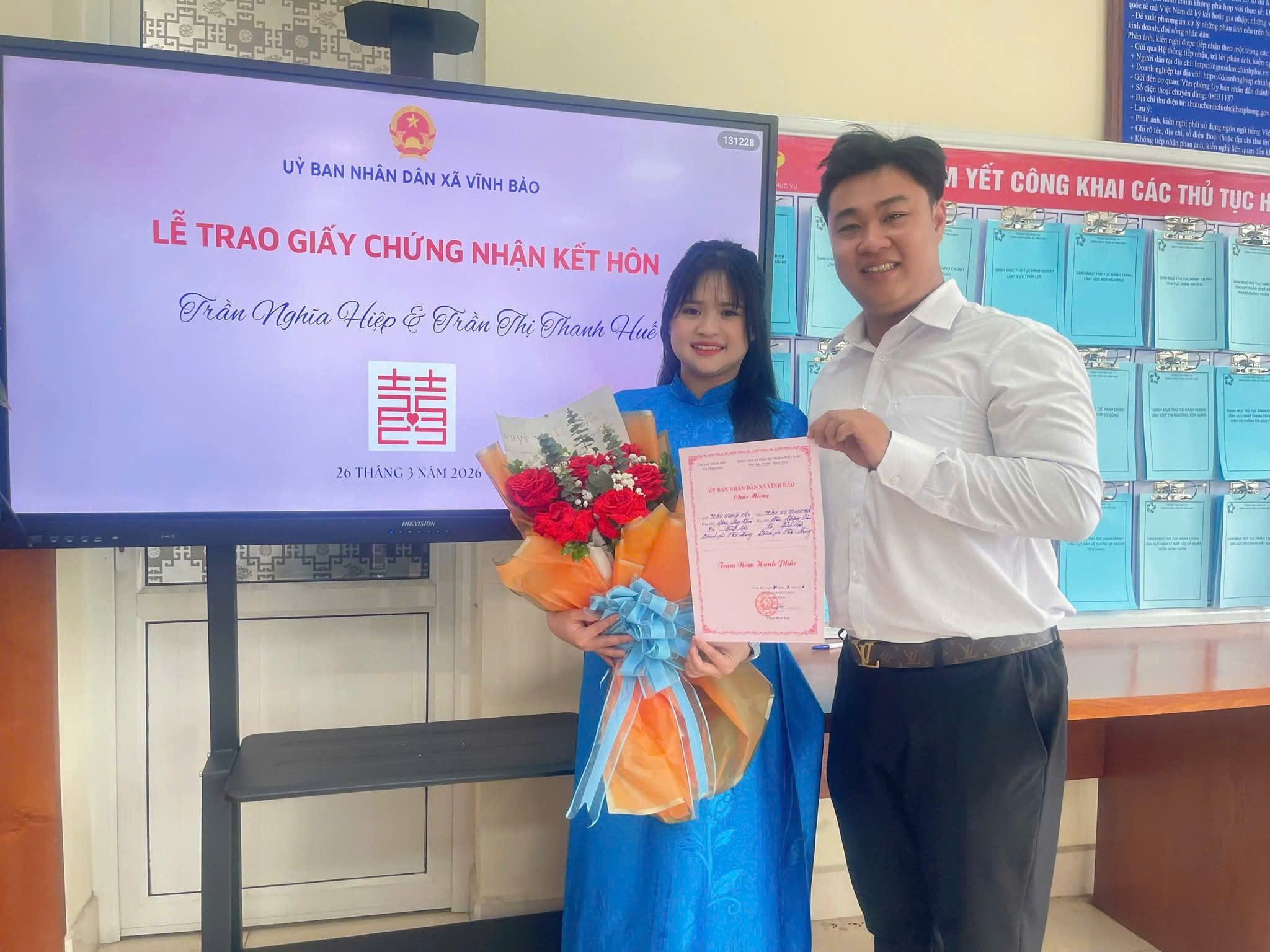 Chiều cùng ngày, tại Trung tâm Phục vụ hành chính công xã Vĩnh Bảo, UBND xã tiếp tục trao Giấy chứng nhận kết hôn cho cặp đôi Trần Nghĩa Hiệp và Trần Thị Thanh Huế.