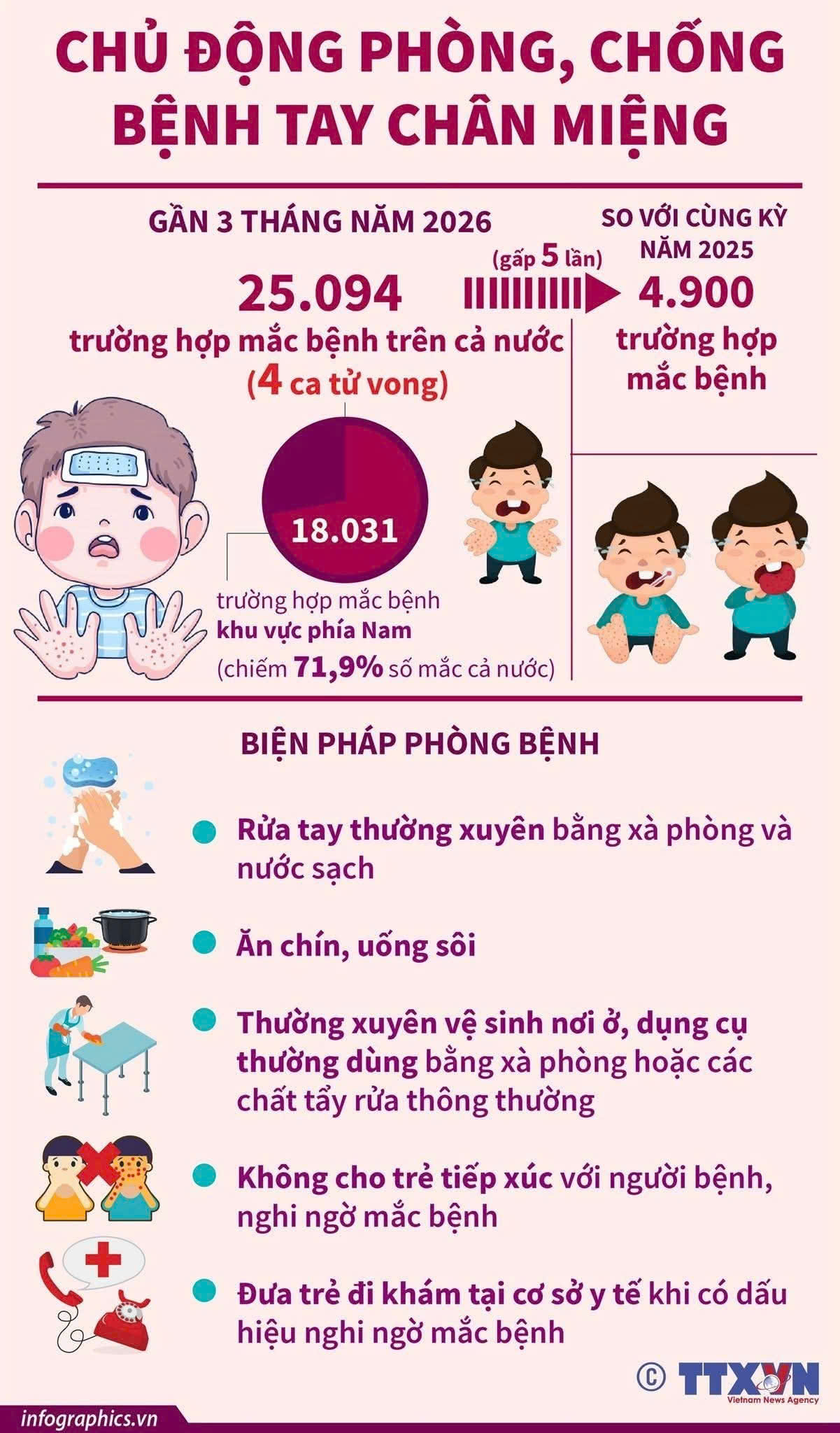 📌Dấu hiệu đặc trưng của bệnh là sốt, đau họng, tổn thương niêm mạc miệng và da chủ yếu ở dạng phỏng nước thường thấy ở lòng bàn tay, lòng bàn chân, đầu gối, mông. Hầu hết các ca bệnh đều diễn biến nhẹ. Tuy nhiên ở một số trường hợp, bệnh có thể diễn biến nặng và gây biến chứng nguy hiểm như viêm não - màng não, viêm cơ tim, phù phổi cấp dẫn đến tử vong nên cần được phát hiện sớm, điều trị kịp thời.