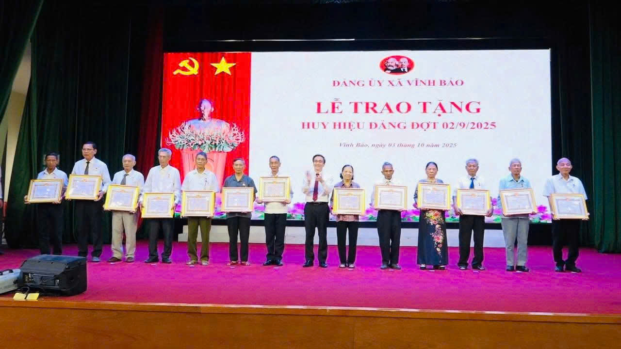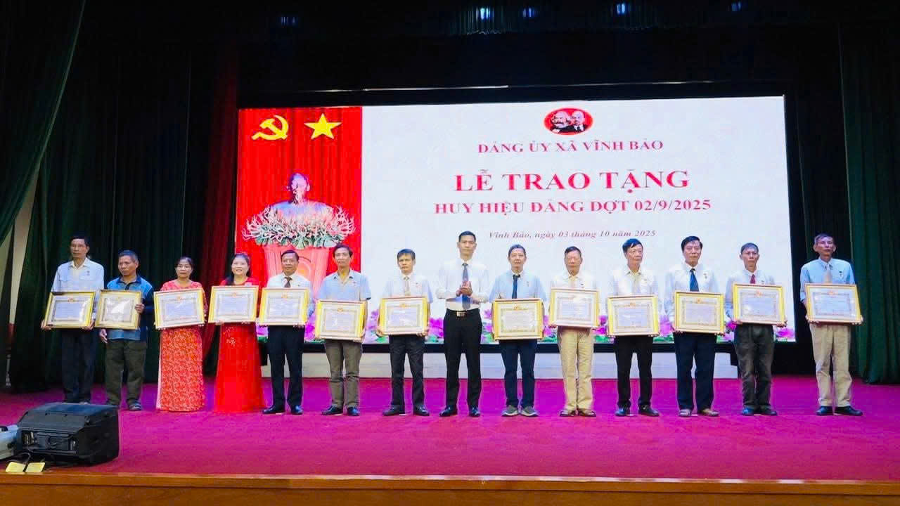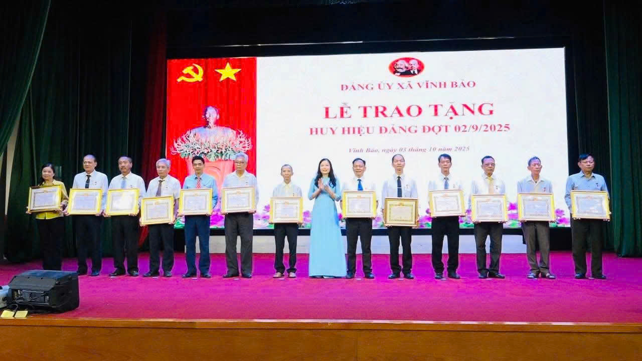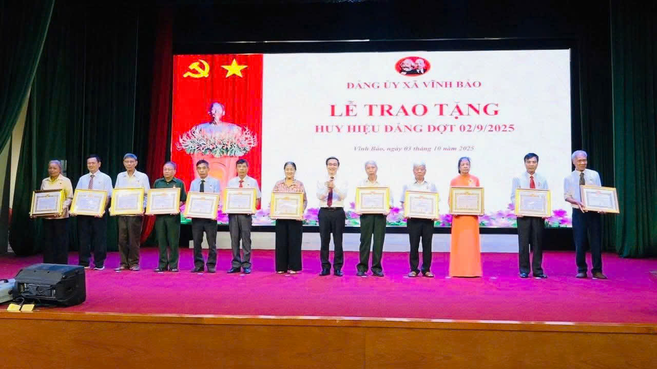 Theo Quyết định số 375-QĐ/TU ngày 18/8/2025 của Ban Thường vụ Thành ủy Hải Phòng, dịp này Đảng bộ xã Vĩnh Bảo đã trao tặng Huy hiệu Đảng cho 66 đảng viên và truy tặng Huy hiệu Đảng cho 01 đảng viên. Đây là sự ghi nhận, trân trọng của Đảng đối với quá trình rèn luyện, cống hiến của các đồng chí đảng viên cho sự nghiệp cách mạng.
