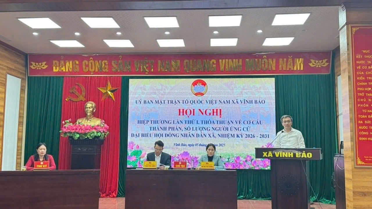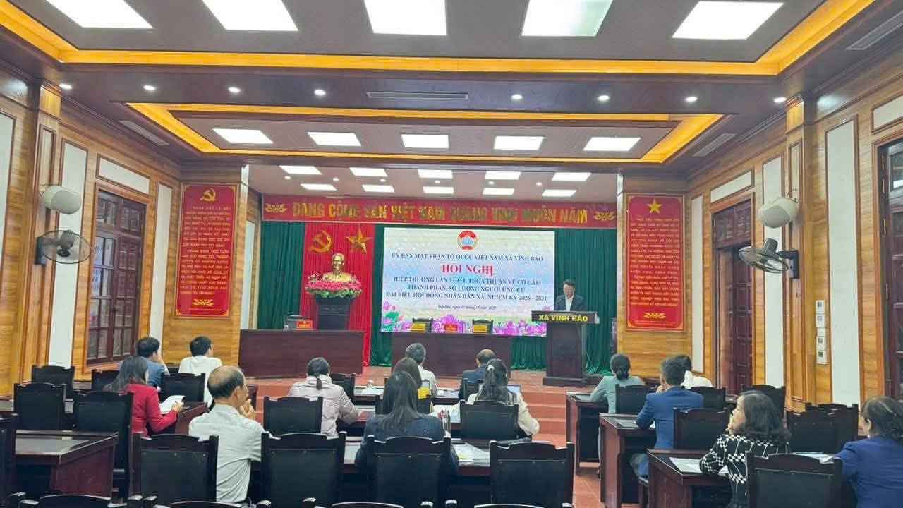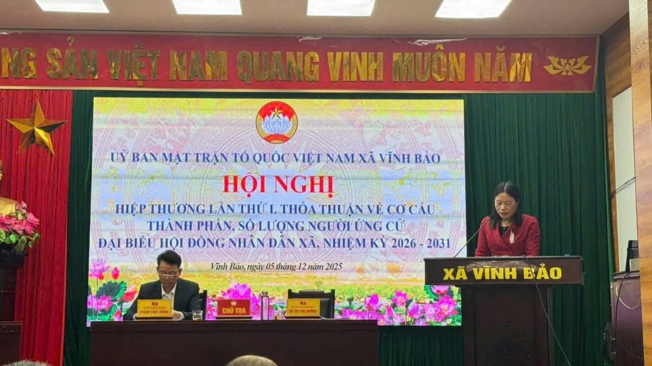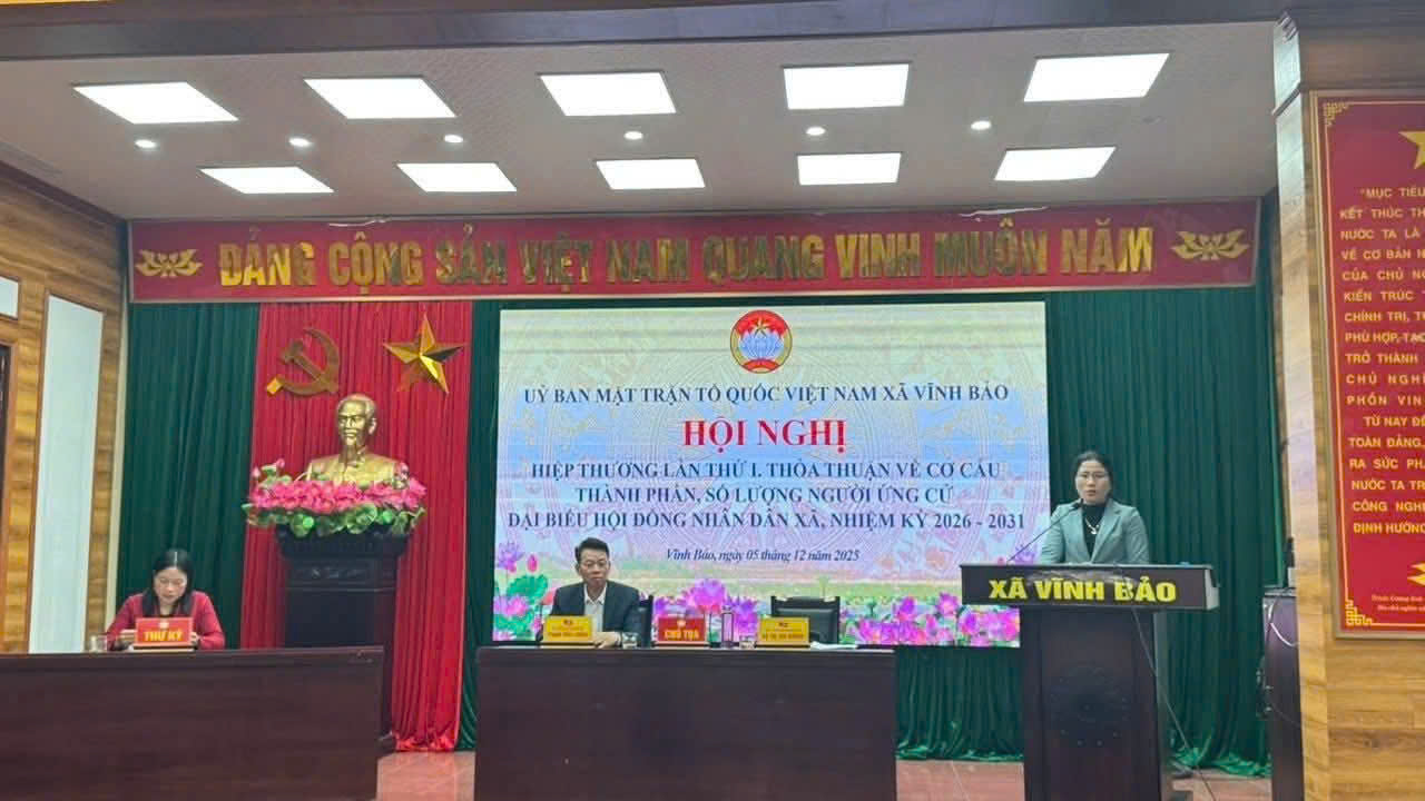 Sáng ngày 05/12, tại Hội trường Đảng ủy xã Vĩnh Bảo, Ủy ban MTTQ Việt Nam xã Vĩnh Bảo đã tổ chức Hội nghị hiệp thương lần thứ Nhất nhằm thỏa thuận về cơ cấu, thành phần và số lượng những người được giới thiệu ứng cử đại biểu Hội đồng nhân dân xã nhiệm kỳ 2026-2031.