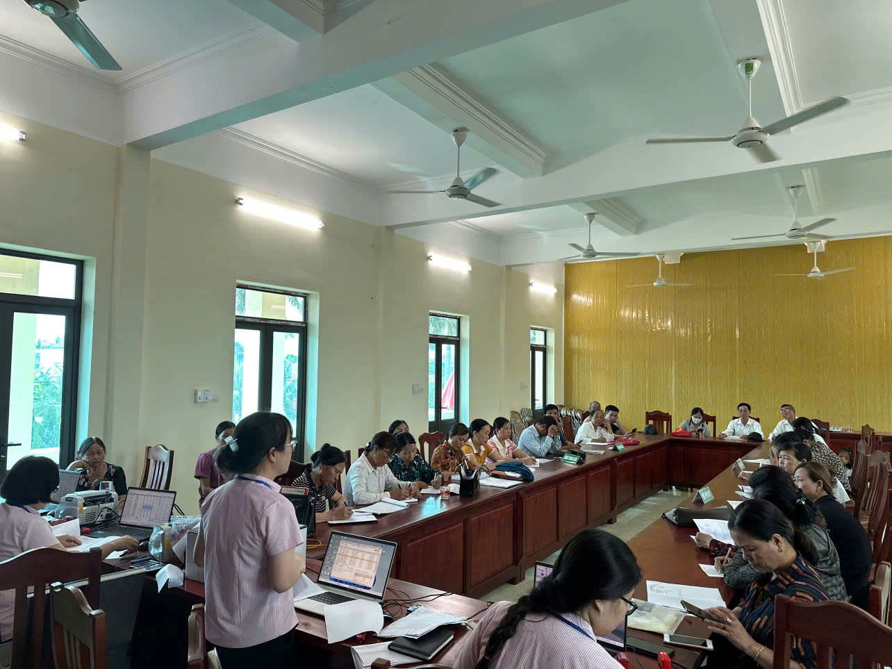 Cán bộ NHCS tuyên truyền về việc gửi tiền tiết kiệm tại cuộc họp giao ban với tổ chức hội đoàn thể và tổ Tiết kiệm trong buổi Giao dịch tại xã Vĩnh Hải