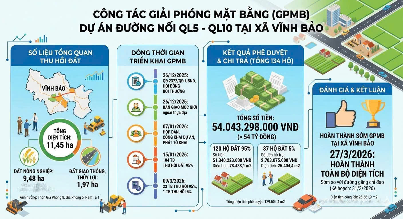 Tính đến ngày 27/3/2026, UBND xã Vĩnh Bảo đã hoàn thành công tác giải phóng mặt bằng toàn bộ diện tích GPMB dự án thuộc địa bàn xã Vĩnh Bảo và hoàn thành SỚM so với đường găng kịch bản GPMB dự án theo chỉ đạo của UBND thành phố (dự kiến hoàn thành 31/3/2026).